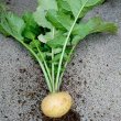 ・春、秋まき可能な黄金色 (肉色も黄金色) の小カブで、甲高な形です。