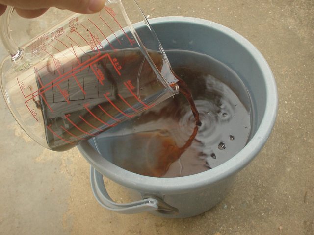 - その後、規定の希釈に薄めます。1000リットルの水を加えよく撹拌します。これで10000倍溶液ができあがります。水を500リットルにすれば5000倍溶液ができます。