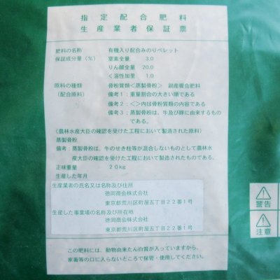 ・この肥料には動物由来たんぱく質が入っていますから、家畜等の口に入らないところで保管・使用してください。
